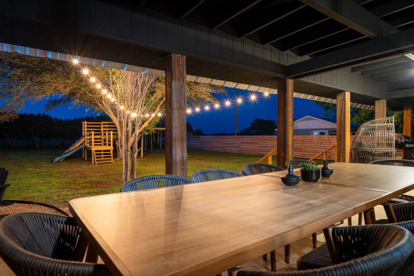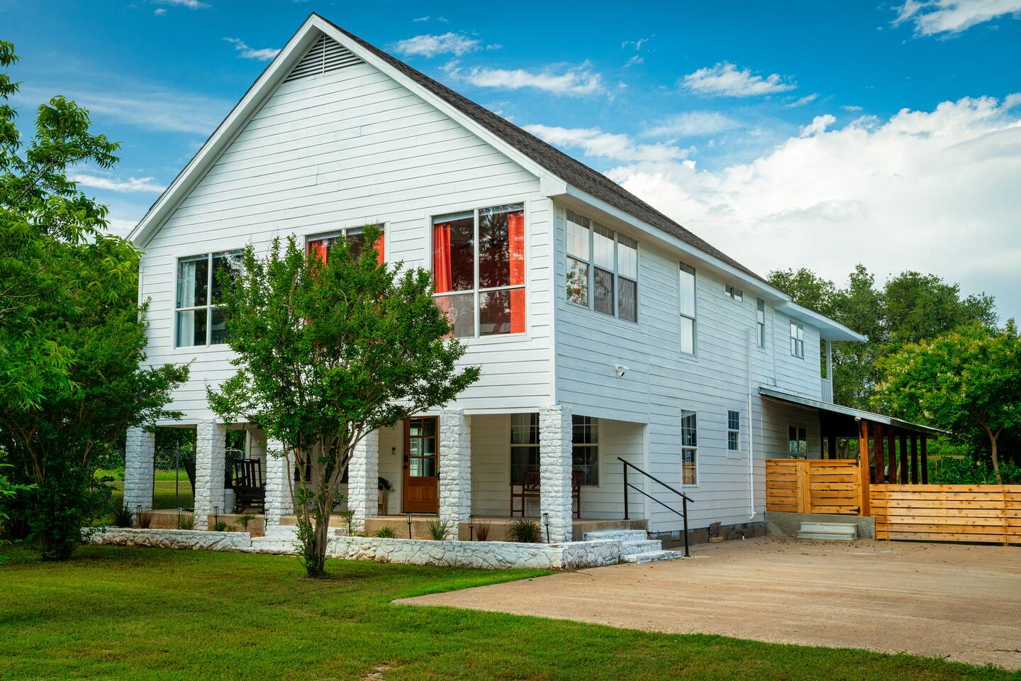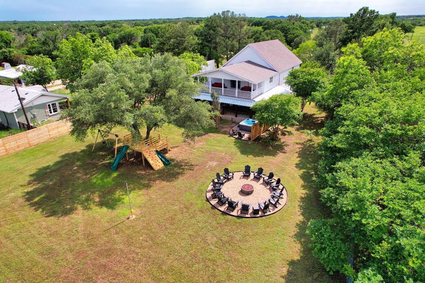 This property is newly updated and curated to make our guests experience inviting and stress free. Each bedroom includes luxurious pillows, bedding and extra blankets. Bedrooms are outfitted with blackout shades and curtains so there are no early morning wake ups on vacation. Phone-charging stations are near every bed for the added convenience of today’s many devices. Follow us on IG @littleredsnestrentals to view videos of the space. PROPERTY SIZE: 2,850 sqft house on 1 acre of land AT A GLANCE: - 10 beds: 2 King, 2 Queen, 2 Bunk Beds w/4 Twin, 1 Full w/Twin Trundle - 3 Full Bathrooms - master includes towel warmer - Hot tub for 8 - Speakeasy behind secret door with bar, barware and glassware, mini fridge, and Texas Hold’em - 3 Porch areas with lots of seating - Gas Fire pit surrounded by 14 chairs - Backyard features treehouse with 2 slides, rock climbing wall, swing set for all ages - 4 burner gas grill - Outdoor games: corn hole, ladder ball, giant Connect 4, tetherball, giant Jenga - Board games, cards, & dice - Game room includes arcade games & foosball - Full Size Laundry Machine downstairs & stackable laundry machines in master bathroom - Workout Equipment: 3 Yoga Mats, Free Weights, Stretch Bands, - Fully equipped chef’s kitchen with Microwave, Oven, Toaster and Air Fryer - Coffee bar with drip coffee maker and french press, coffee & filters - Brita drinking water filter - Dining table seating for 12 - Counter bar seating for 4 - Eating utensils for baby, toddler & young children - Outdoor dining table for 10 - Keyless entry with individual codes - 500gb wifi - TVs: one in every bedroom 50” x4 & 32” x1, one in each living room 50” and 65” & one outside 50” all include Roku - Charging ports by every bed - Hair dryer in every bathroom - Full length mirrors - Pack n' Play travel crib with sheet - Monitor & baby bath - High chair LOCATION: - Outside the city limits - 10 minutes from downtown Glen Rose - Approximately 15 min. from Fossil Rim, a driveable wildlife park - Approximately 15 min. from Dinosaur Valley State Park - Approximately 10 min. from Big Rocks Park, off Paluxy River - Approximately 15 min. from Squaw Valley Golf Course UPSTAIRS MASTER BEDROOM - King Bed, en Suite Bathroom, Private Patio Unwind in a cozy king-size bed, ensuite bathroom, and your own private patio boasting scenic countryside views. Sink into high-quality linens and plush pillows, surrounded by tasteful decor. Every detail has been meticulously curated to ensure a restful night's sleep. Additionally, you may pass through the hidden door to access the speakeasy. A place where grownups can unwind and enjoy some well deserved fun. The lounge is fully equipped with a mini fridge, Texas Hold’em, and barware essentials. DOWNSTAIRS MASTER BEDROOM - King Bed The second bedroom is all about comfort and accessibility. Featuring a cozy king-size bed with plush pillows and luxury linens. With access to a full bathroom with a handy grab bar, it's a dreamy retreat for the grandparents in your crew. DOUBLE QUEEN BEDROOM - Two Queen Beds The third bedroom offers a luxurious expansive space with two queen-size beds blanketed in moody lighting, setting the perfect ambiance for unwinding after a day filled with excitement. Amidst the shadows, find solace and relaxation. Additionally, a dedicated workspace awaits, offering a secluded haven for moments of focused productivity amidst the captivating atmosphere. DINOSAUR ROOM - Two Twin Bunks, Four Beds The fourth bedroom is an ideal space for kids or young adults, featuring two sturdy bunk beds that comfortably accommodate four. Packed with entertainment, this room promises hours of enjoyment with a foosball table, arcade games, and a variety of toys and books suitable for all ages. SAFARI ROOM - Full Bed, Twin Trundle The fifth bedroom showcases a full-size bed with a twin trundle, ideal for the young ladies in your group who adore slumber parties. Complete with a vanity adorned with Hollywood-style lights, this room beckons girls to indulge in hours of playful dress-up and hairstyling fun. BATHROOMS: Every bathroom is equipped with an abundance of plush towels and essential amenities. We've also installed plenty of towel hooks to accommodate all guests' items. There's a full bathroom downstairs in the hall, another at the top of the stairs, and a third en suite bathroom off the upstairs master. KITCHEN: The cook in your party will be delighted to find a fully stocked kitchen with everything you need to make memorable meals during your stay. You'll find baking sheets, pots and pans, cutting boards, a crockpot, waffle maker, blender, and many other essentials. The refrigerator offers plenty of space along with a Brita water filter and a pull-out freezer. For quick cooking, there's an oven, toaster, microwave, and air fryer. Enjoy the convenience and versatility of this well-equipped kitchen, perfect for creating delicious dishes while on vacation. To make mealtime enjoyable and worry-free for all our guests, we've included plastic dinnerware, silverware, and cups specifically for our young eaters. For added convenience, you'll also find baby spoons, sticky-bottom plates, and lidded cups, ensuring parents can relax and savor their meals without any fuss. Just off the kitchen is our quaint and sunny coffee and tea room, perfect for that early morning indulgence that wakes the soul. You'll find a coffee maker, hot water kettle, filters, and coffee grounds that our guests are welcome to enjoy. This cozy space is ideal for starting your day with a fresh cup of coffee or a soothing tea. LIVING ROOMS: Our home boasts two living rooms, one in the front and another down the hall. Both rooms are furnished with luxurious large L-shaped couches and additional side seating. This setup allows grown-ups to enjoy a movie in one room while the younger ones watch something else in the other. Each living room features a large Roku TV that can be used to sign into any streami
